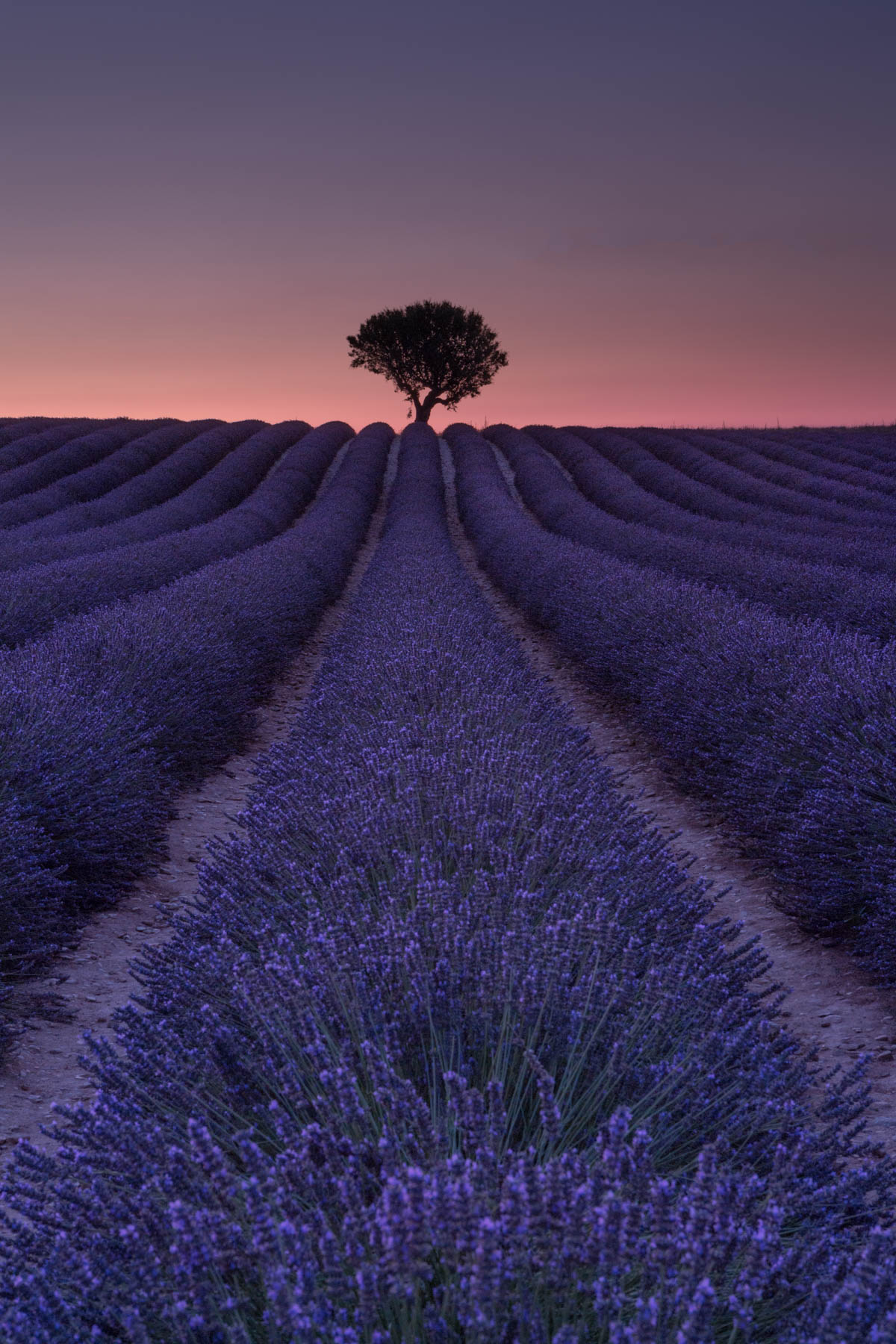 A serene sunrise over the Valensole Lavender Fields, where a rich purple sky softly illuminates the landscape. Without the sun in view, the scene captures a calm and dreamlike atmosphere.