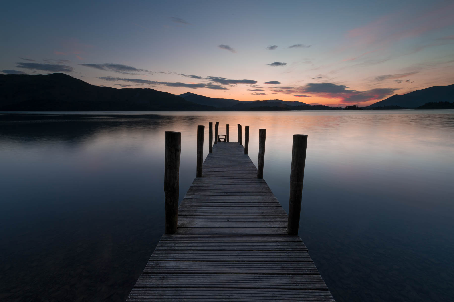 A calm and atmospheric sunset over Derwentwater, capturing the quiet beauty of Ashness Jetty beneath moody skies. Printed on premium 350gsm Barita FB fine art paper for rich tones and fine detail.l.